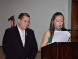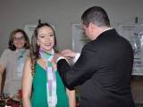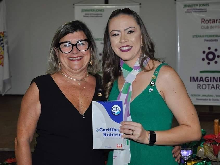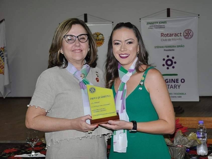 O padrinho José Luiz de Matos Avanzi a contemplou com o distintivo rotário, a Governadora Assistente Vanderléia Rosana Palhari Bispo com o quadro da Prova Quádrupla e a Secretária Gisele Teresinha Cogo Buttarello com a Cartilha Rotária.