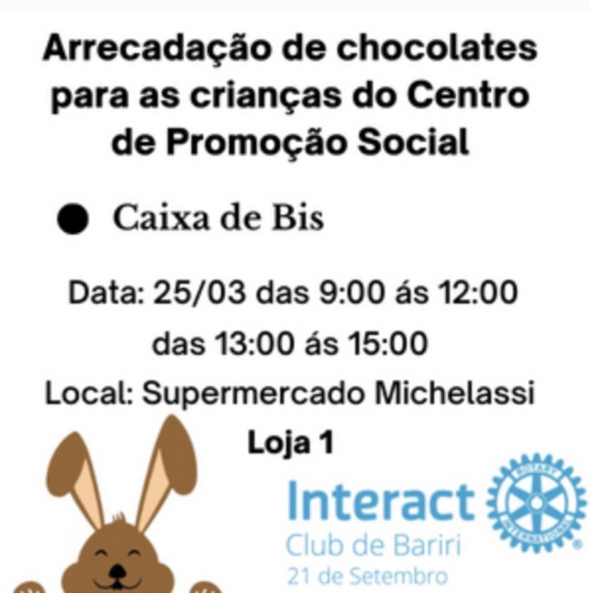 O Interact Club de Bariri - 21 de Setembro inicia campanha para arrecadação de chocolates tipo Bis. As caixas serão doadas para o Centro de Promoção Social, entidade que atua na área de educação complementar de adolescentes e jovens da cidade. Os interactianos estarão atuando em dias específicos, junto aos Supermercados Michelassi, a fim de incentivar os frequentadores às doações.