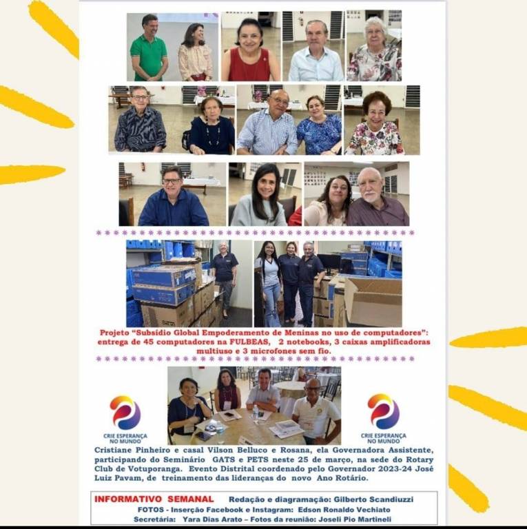 Texto do Rotary Club de São José do Rio Preto: Boletim Informativo Semanal da 27ª reunião ordinária realizada em 20/03/2023, elaborado pelo Companheiro Governador Gilberto Scandiuzzi e colaboração de Edson Vechiato, Joseli Martineli e Yara Arato.