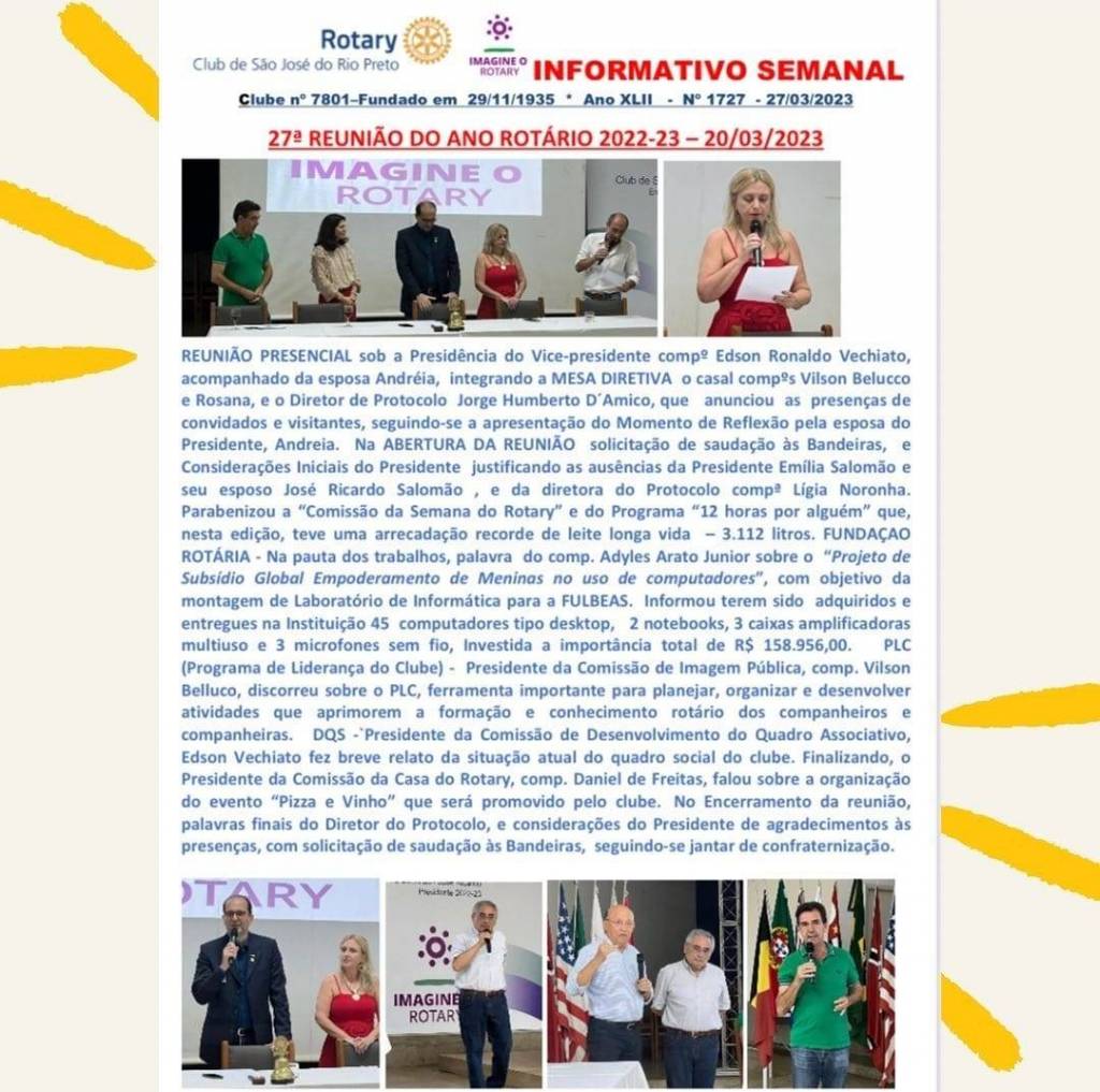 Rotary Club de São José do Rio Preto: Boletim Informativo Semanal da 27ª reunião ordinária realizada em 20/03/2023