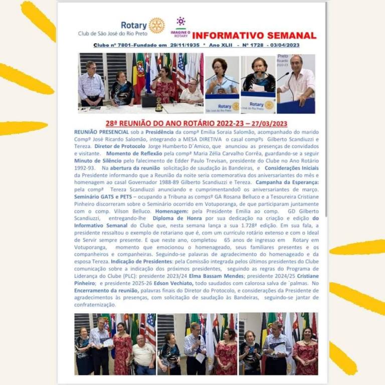 Boletim informativo semanal da Reunião dia 27/03/2023, elaborado pelo Governador Gilberto Scandiuzzi e auxílio Yara Dias Arato e Edson Vechiato.