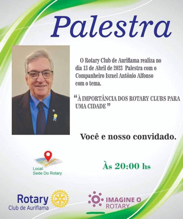 O Rotary Club de Auriflama realiza na próxima quinta feira dia 13 de abril uma Palestra com o Companheiro Israel A. Alfonso,