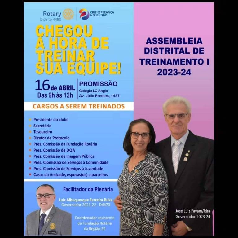Através desse treinamento, nós nos atualizamos, aprendemos e demos início ao próximo ano Rotário 23-24 sob o lema CRIE ESPERANÇA NO MUNDO e a liderança do casal governador José Luiz Pavam e Rita.