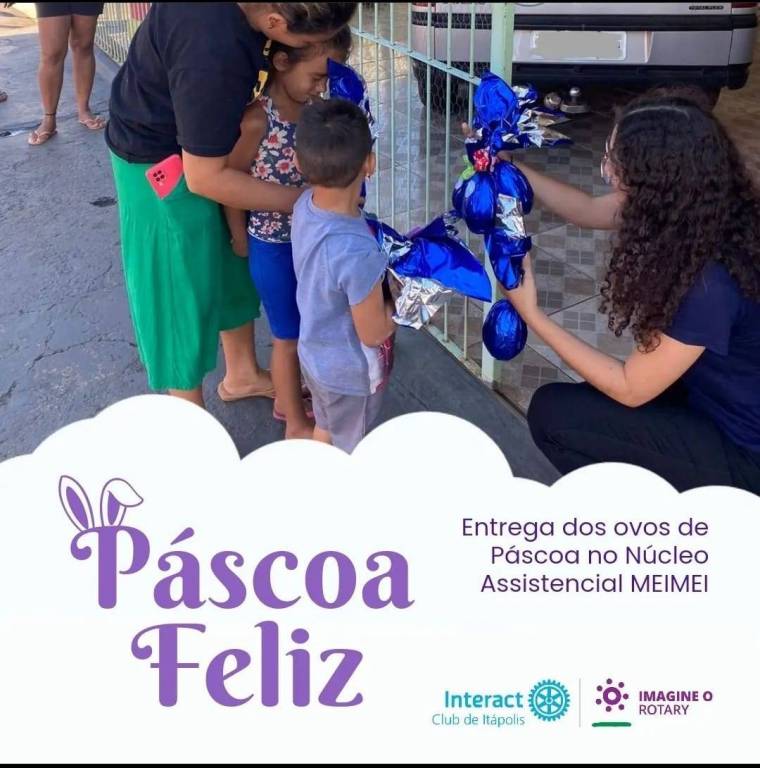 Texto do Interact Club de Itápolis: No dia 20•04•2023 realizamos a entrega de ovos de Páscoa no núcleo assistencial MEIMEI.