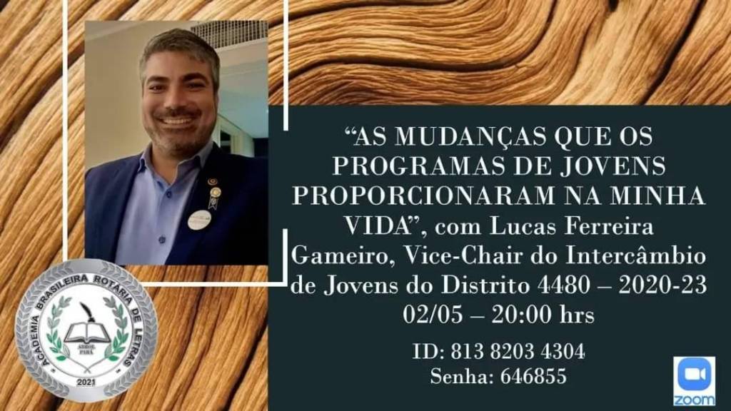 Caros amigos, no próximo dia 02/05/2023, às 20:00 hrs, teremos um encontro com Lucas Gameiro , Vice-Chair do Intercâmbio de Jovens do Distrito 4480 no período 2020-23, quando abordará o tema “ AS MUDANÇAS QUE OS PROGRAMAS DE JOVENS PROPORCIONARAM NA MINHA VIDA ”.