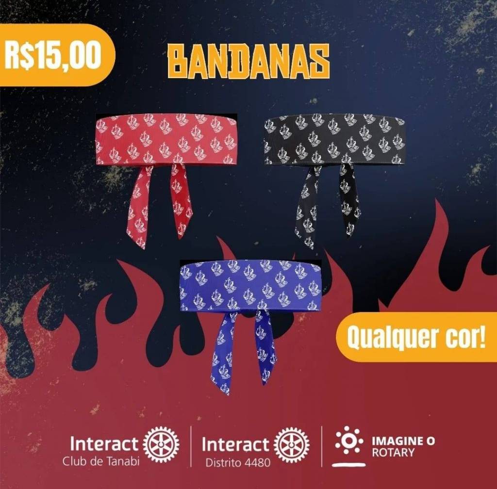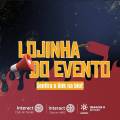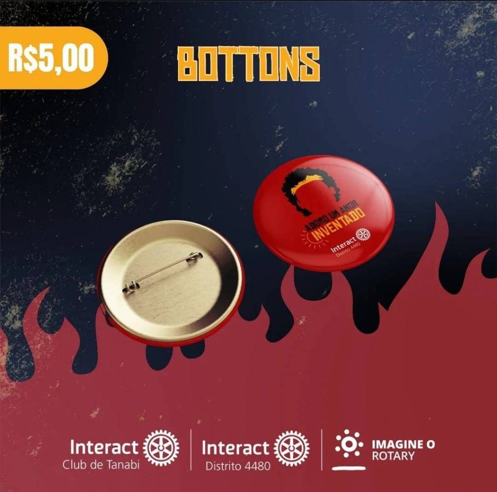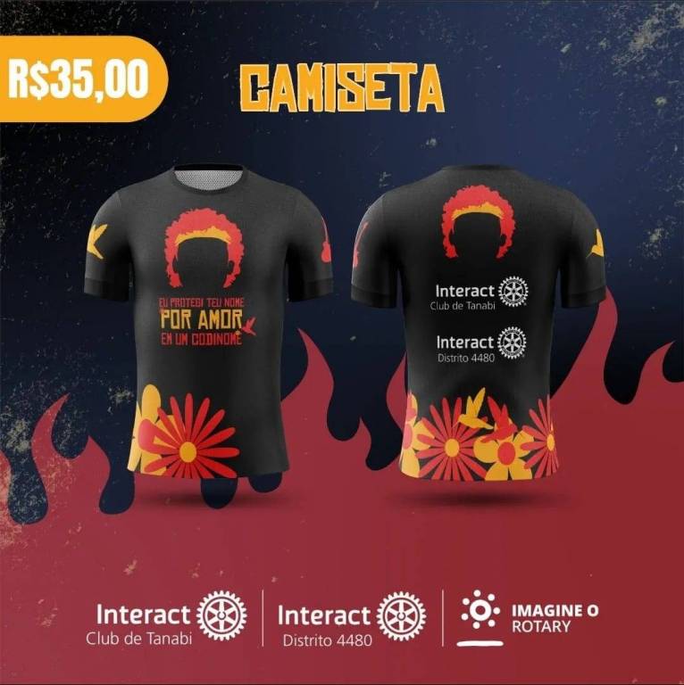 | Texto alternativo: Arte com as logos do Interact Club de Tanabi e do Distrito 4480 em branco, juntamente com a logo da gestão "Imagine o Rotary", com o fundo azul e preto e detalhes em amarelo, ao centro está escrito "LOJINHA DO EVENTO" acompanhado de uma figura de um megafone e outra de uma etiqueta. Arrastando para o lado temos os produtos e seus respectivos valores.