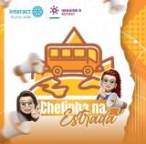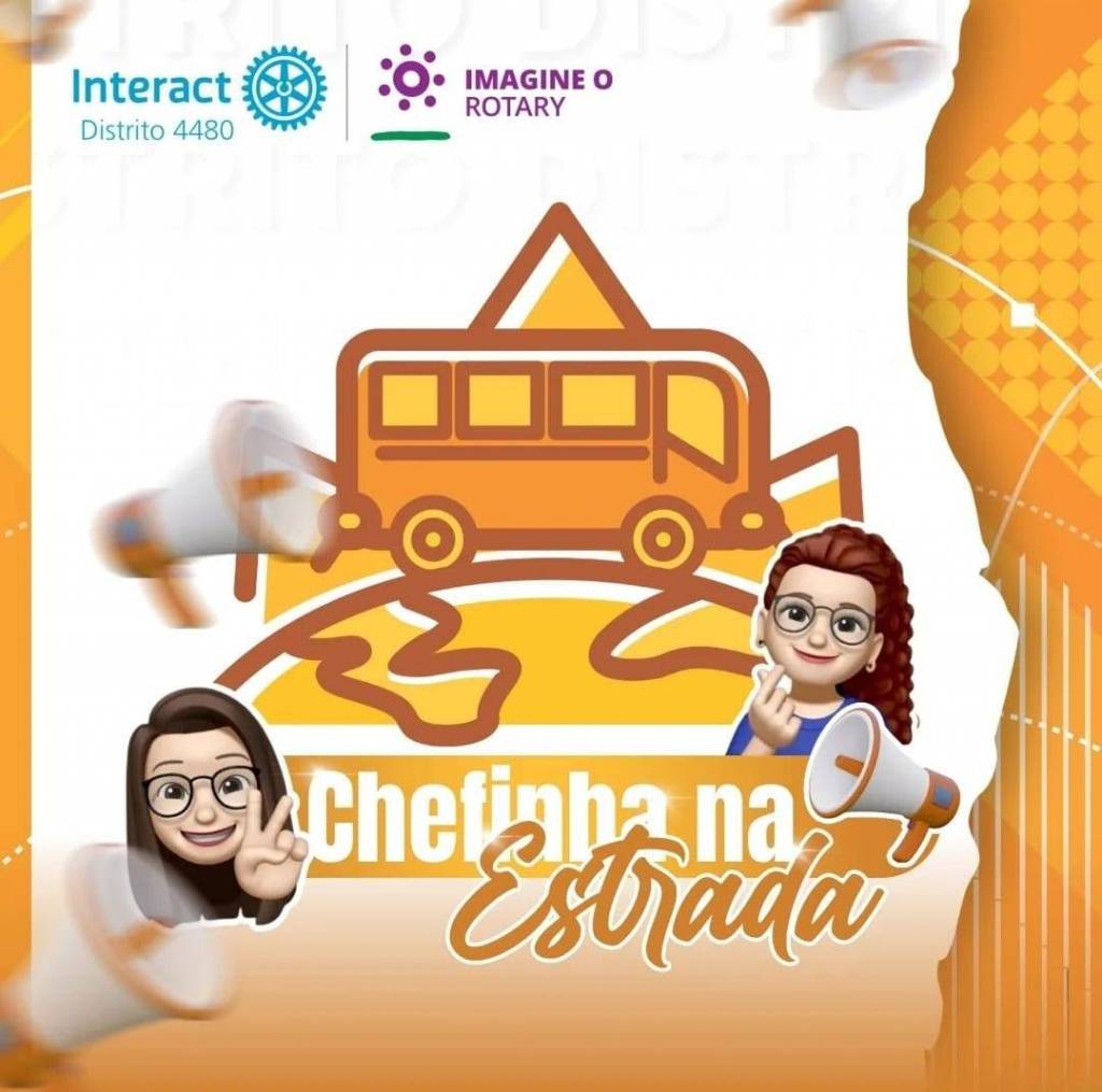 | Texto alternativo: Arte com o fundo em tons de amarelo, junto à logo do Distrito 4480 em azul e ao lado a logo do lema, ambas em cores. Ao centro está escrito a frase "CHEFINHA NA ESTRADA". Acima está o desenho de um ônibus em uma estrada, tudo em tons de amarelo. Aos lados estão presentes memojis de nossa RDI Giovanna Seki e Roseli Batista.
