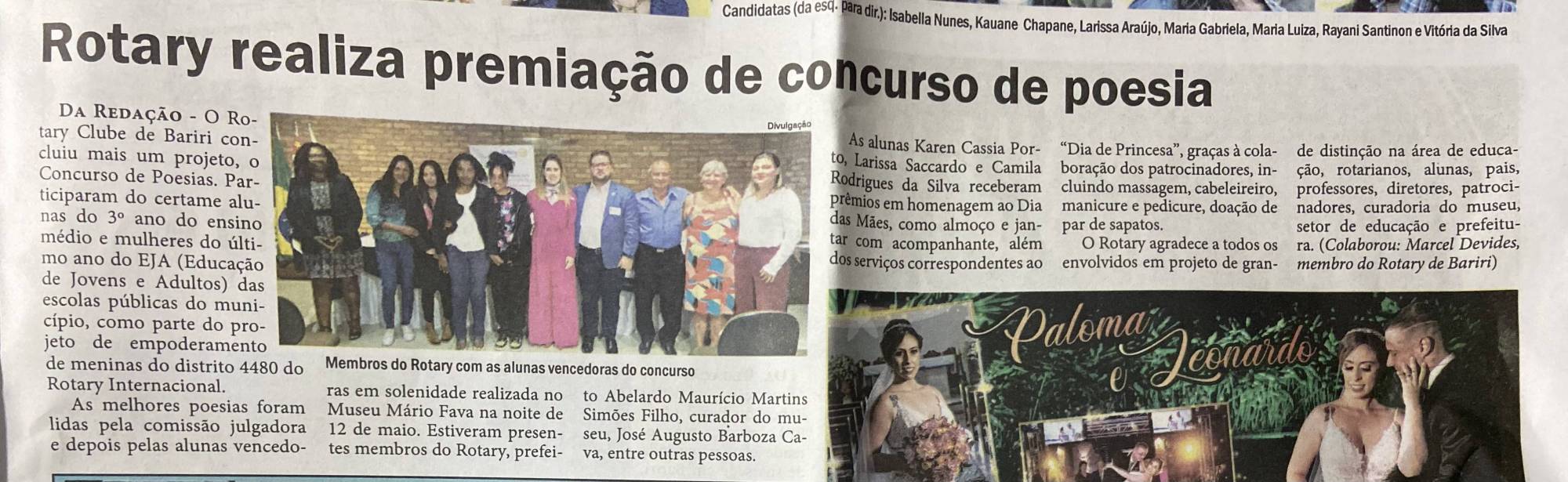 O Jornal Candeia, semanário mais tradicional da cidade, publicou matéria sobre o concurso de redação do Rotary Club de Bariri, destacando a solenidade de premiação das alunas vencedoras, apenas de escolas públicas, projeto que faz parte das metas do distrito 4480 de Rotary Internacional, ao enfatizar o empoderamento de meninas.