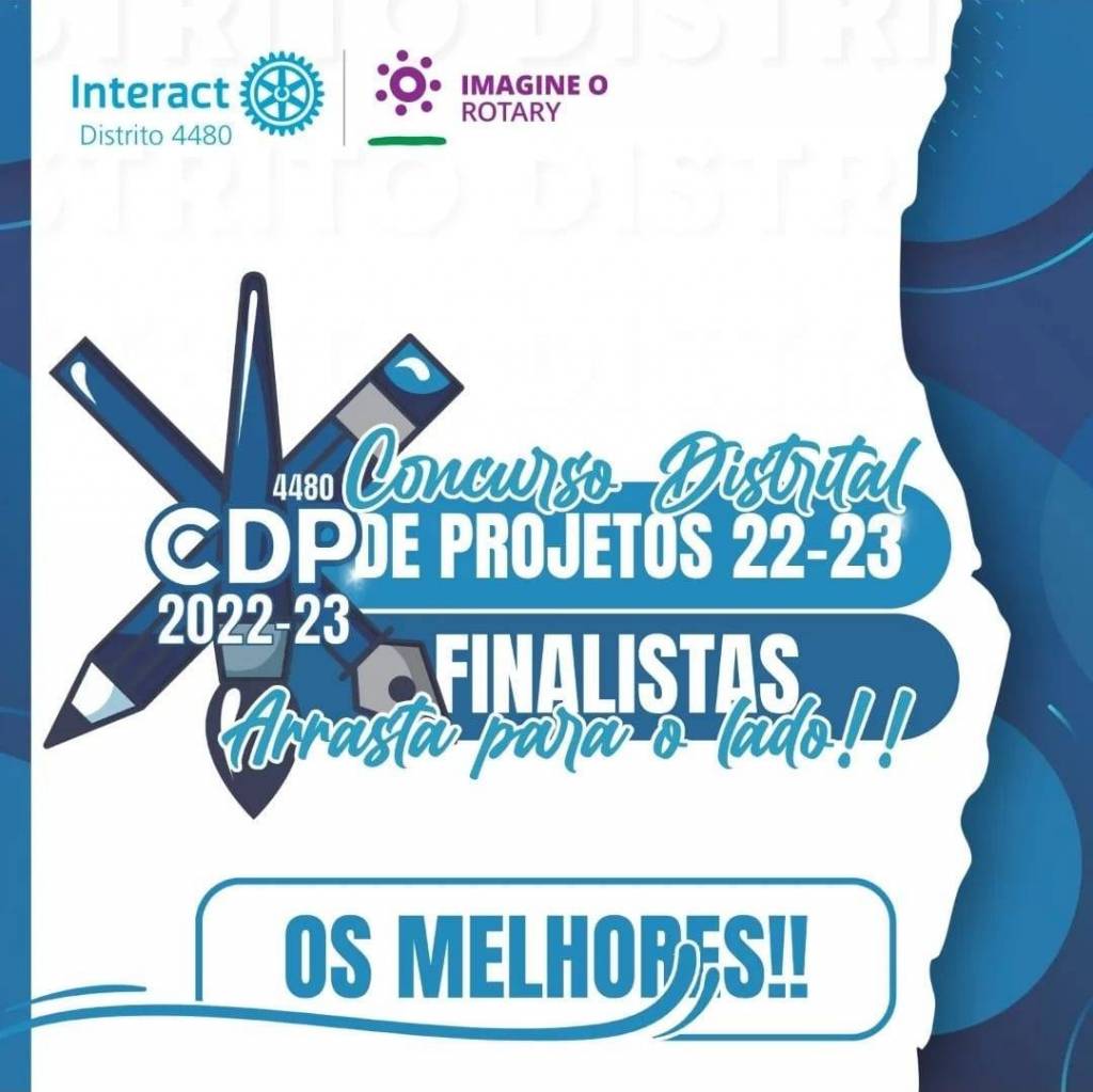 | Texto alternativo: Arte com o fundo em tons de azul, junto à logo do Distrito 4480 em azul e ao lado a logo do lema, ambas em cores. Ao centro está a logo do Concurso Distrital de Projetos 2022-23, escrito também "Concurso Distrital de Projetos 22-23" e logo abaixo "Finalistas - Arrasta para o lado!!". Abaixo de tudo isso temos um retângulo arredondado escrito dentro "OS MELHORES!!".