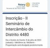É com muita alegria que a Comissão Distrital de Intercâmbio Internacional de Jovens informa que será realizado no ano rotário 2023/2024 o II Seminário de Intercâmbios do Distrito 4480, que será realizado de forma presencial na cidade de São José do Rio Preto, no dia 08/07/2023, no Hotel Michelangelo.