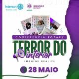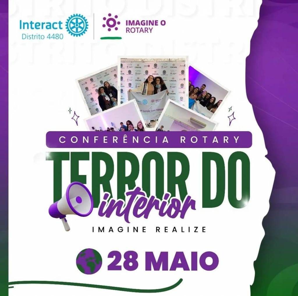 | Texto alternativo: Arte com o fundo em tons de roxo e verde, junto à logo do Distrito 4480 em azul e ao lado a logo do lema, ambas em cores. Ao centro está escrito "Conferência Rotary" logo abaixo "TERROR DO INTERIOR - Imagine Realize". Também temos algumas fotos ao centro e arrastando para o lado temos demais imagens.