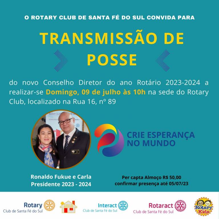 É com imensa alegria que convidamos os companheiros para Festiva de Posse do Conselho Diretor do Rotary Club de Santa Fé do Sul.