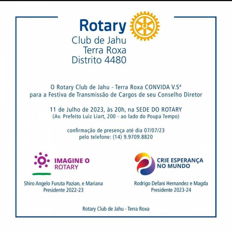 Convite para Transmissão de Cargos e Conselho Diretor Rotary Club de Jahu Terra Roxa.