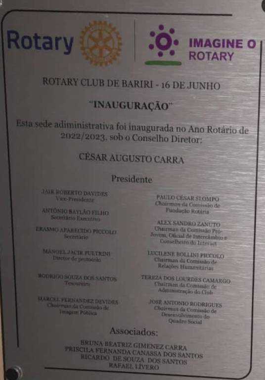 O Rotary Club de Bariri reuniu-se ontem em sua nova sede para a 1ª reunião ordinária do ano. Entre os assuntos principais em pauta, festividade do transmissão do cargo de presidente e posse do conselho diretor para o ano rotário 2023-2024, Festa Julina do Lar Vicentino com barraca do milho no próximo dia 15, e a décima edição do Almoço à Mineira, no dia 23. A nova sede será inaugurada em breve, após os eventos de julho.