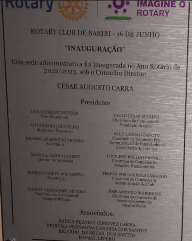 O Rotary Club de Bariri reuniu-se ontem em sua nova sede para a 1ª reunião ordinária do ano. Entre os assuntos principais em pauta, festividade do transmissão do cargo de Presidente e posse do conselho diretor para o ano rotário 2023-2024, Festa Julina do Lar Vicentino com barraca do milho no próximo dia 15, e a décima edição do Almoço à Mineira, no dia 23. A nova sede será inaugurada em breve, após os eventos de julho.