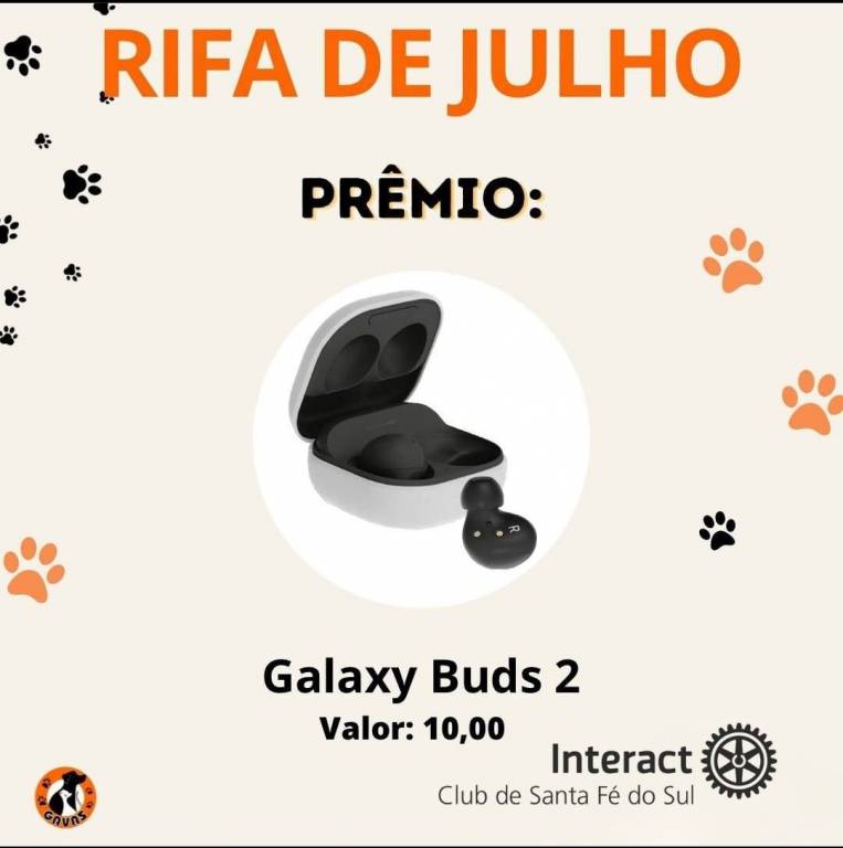 Nós do Interact Club estamos rifando um fone bluetooth modelo Samsung Galaxy Buds 2. O dinheiro arrecadado será totalmente revertido aos animaizinhos do canil municipal. A rifa conta com 100 números no valor unitário de 10,00. Os números poderão ser adquiridos pelo instagram do GAVAS ou pelo nosso direct. Compre já seu número e ajude os animaizinhos resgatados em situações de fragilidade!