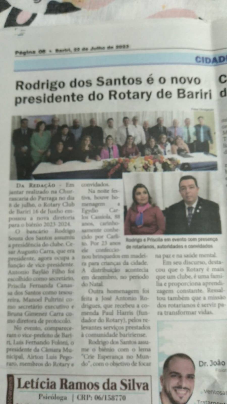 O Jornal Candeia de Bariri publicou matéria em última edição, veiculada no sábado passado, sobre a cerimônia de posse do Conselho Diretor e transmissão do cargo de presidente do Rotary Club de Bariri 16 de Junho. Rodrigo Souza dos Santos assume a presidência da gestão 2023-2024 com um calendário de atividades já fechado.
