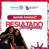 #ParaTodosVerem : Arte com fundo branco e elementos de grafite nas cores Cardinal e Fuchsia ao redor. Ao centro está escrito "RESULTADOS" em Cardinal. Abaixo, está escrito "Interagindos" e abaixo disso, uma linha em degradê na cor Cardinal. Ao lado esquerdo, temos uma foto de nossas Interactianas. Acima de tudo, há as logomarcas do Distrito 4480 e do lema 2023-24, ambas em cores.