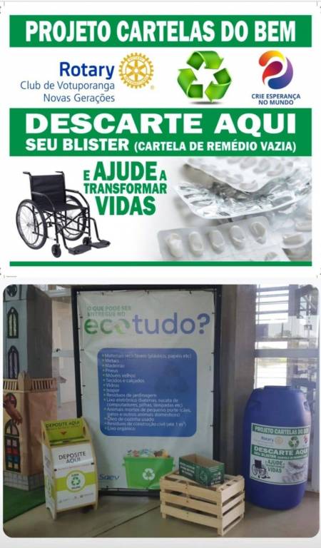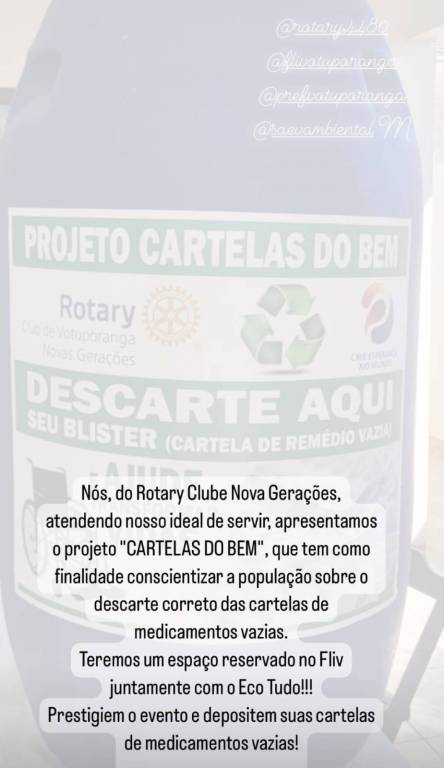 Nós, do Rotary Clube Nova Gerações, atendendo nosso ideal de servir, apresentamos o projeto "CARTELAS DO BEM", que tem como finalidade conscientizar a população sobre o descarte correto das cartelas de medicamentos vazias.