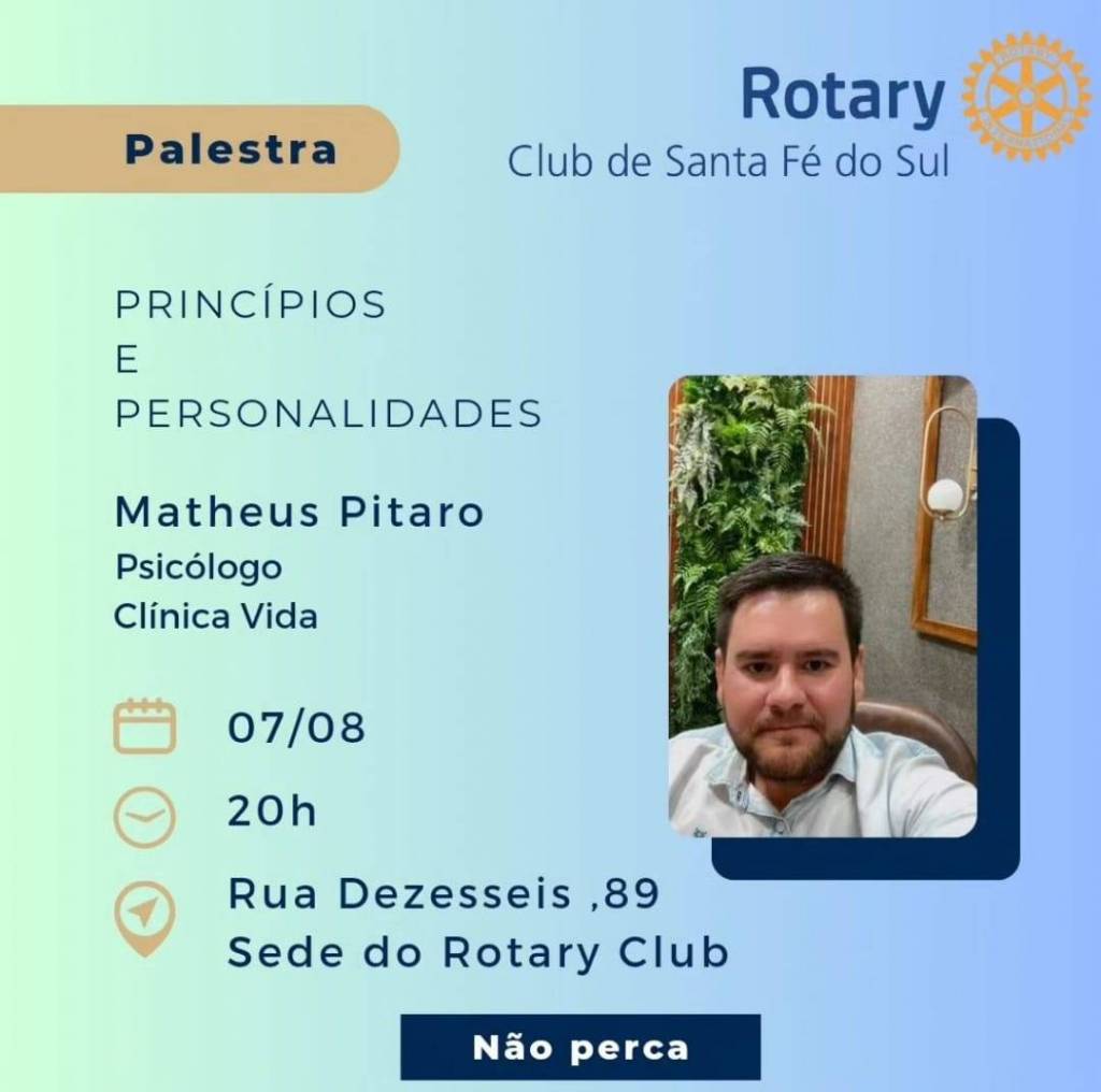 Na reunião do dia 07 de agosto de 2023, o Rotary Club de Santa Fé do Sul recebeu a visita do Psicólogo Matheus Pitaro que realizou um bate papo com os companheiros sobre Princípios e Personalidades.