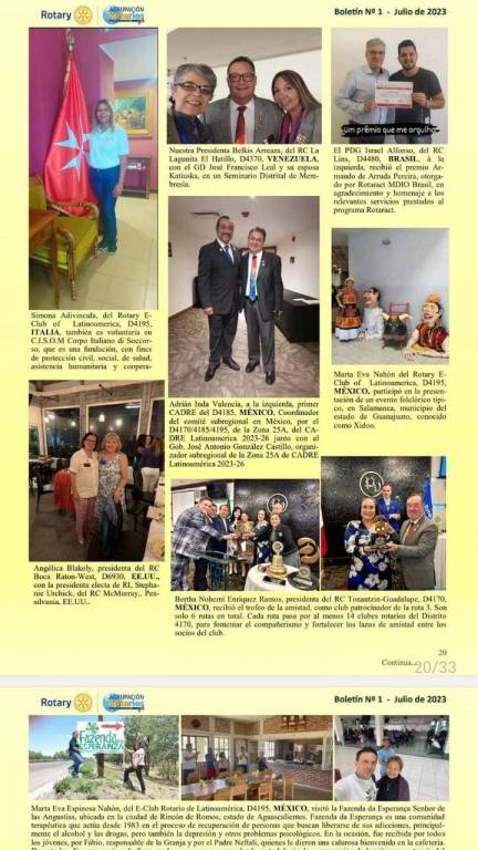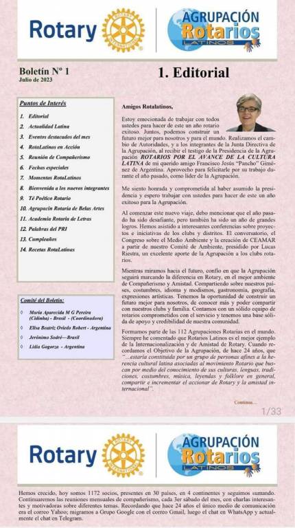 Rotalatinos, presente em 30 países, em 4 continentes, reúne rotarianos e rotarianas que se interessam em trabalhar em temas como, por exemplo, a integração dos povos, cultura, arte e meio ambiente. Hoje, é presidida pela rotariana brasileira Maria Aparecida Pereira, carinhosamente chamada por Cidinha por seus amigos, membro do Rotary Club de São Paulo, amplamente conhecida pela sua reconhecida dedicação às causas do Rotary. Em sua primeira publicação, pois tomou posse recentemente na presidência, teve a gentileza de registrar notícia da homenagem que recebi do Rotaract Brasil. Sucesso, amiga e companheira Cidinha.