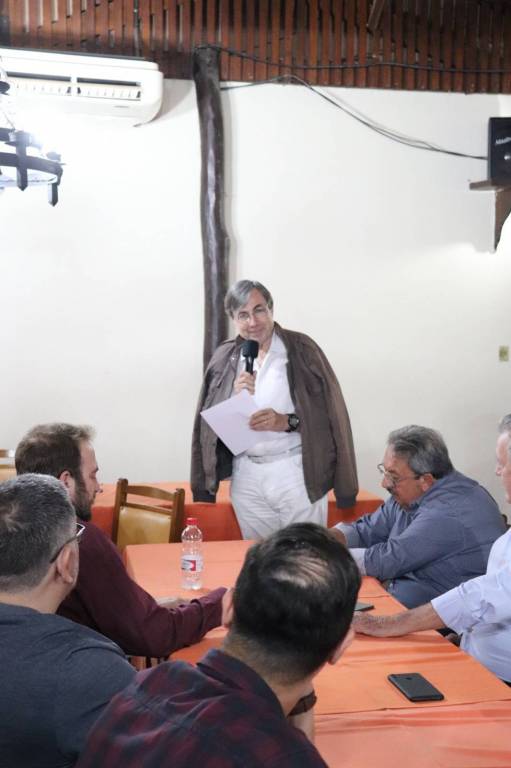 Descrição: Um homem detectado na foto , sentado, com camiseta cinza, usando óculos, cabelos castanhos, segurando um microfone e lendo um papel. Atrás dele o pavilhão de bandeiras. À sua frente, dois homens sentados de costas para quem está olhando a foro, ambos olham para o rapaz que faz a leitura. Há uma mesa com toalha salmão, um celular e uma garrafa de água em cima, onde estão sentados os homens que estão de frente ao rapaz que faz a leitura.