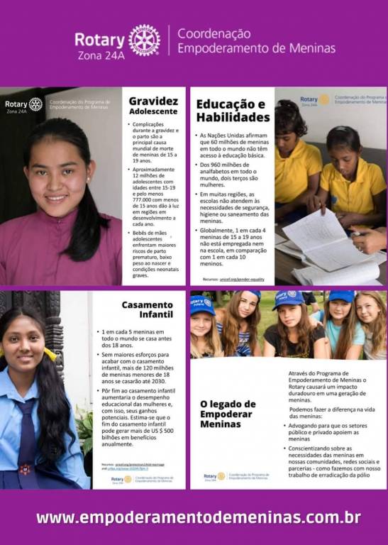 Áudio descrição: no Kard um folheto de jornal com descrição do Rotary Zona 24A Coordenação Empoderamento de Meninas no cabeçalho. Abaixo, lado esquerdo do kard, duas meninas loiras, sentadas uma do lado da outra, sorriso sutil, e texto ao lado falando sobre violência contra meninas. Do lado direito do kard duas meninas morenas lavando as mãos de frente a uma pia, com texto falando sobre saúde e higiene. Na parte de baixo do kard, lado esquerdo, uma menina sorridente, cabelos castanhos, com texto sobre saúde e nutrição e por fim, do lado direito na mesma direção, 4 jovens morenas detectadas, duas de frente para tela e duas de costas, elas sorriem e ao lado texto sobre preferência por filhos. No rodapé do jornal, um site descrito: www.empoderamentodemeninas.com.br