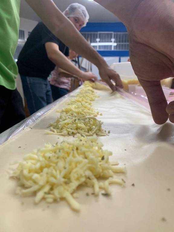 Sobre a mesa muito queijo ralado, massas, temperos e bandeja de isopor.