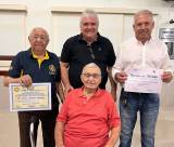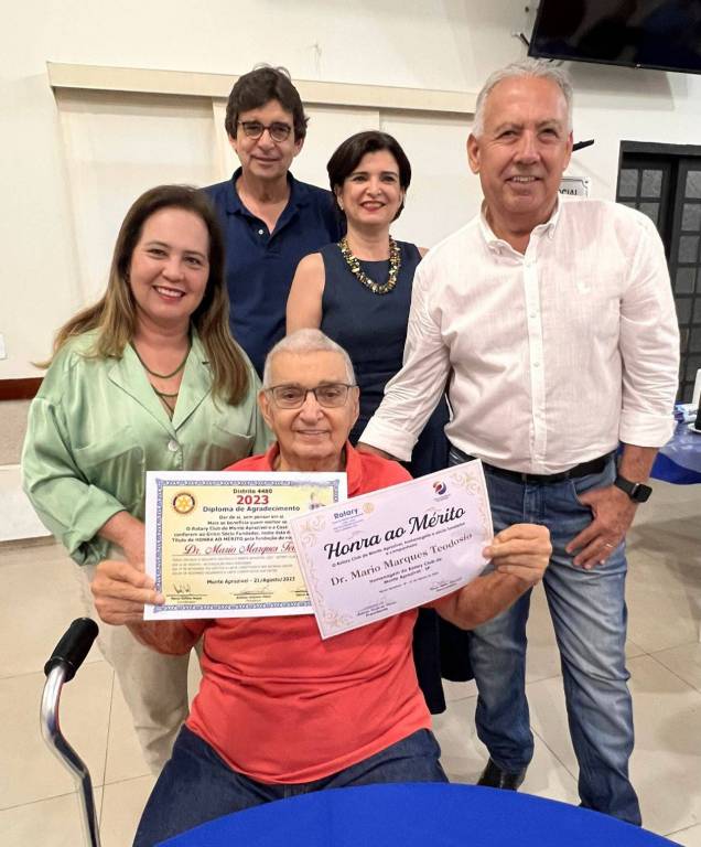 Em pé, atrás do senhor sentado, iniciando pelo lado esquerdo da imagem temos 1 senhor com camiseta do Rotary e calça marrom, grisalho, calvo, baixo; uma mulher de vestido azul escuro, longo, cabelo curto, preto, com um colar; 1 homem alto, cabelo preto, óculos, camisa azul escura e calça marrom claro; 1 homem de camiseta preta, calça jeans, grisalho; 1 homem camisa branca, calça jeans, grisalho, segurando um certificado.