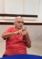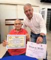 Um senhor sentado ao centro, camiseta vermelha, cabelos grisalhos, de óculos, segurando um certificado de homenagem.
