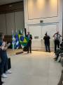 Áudio Descrição: do lado direito da imagem, um senhor, calvo, cabelos grisalhos, terno escuro, sorrindo, segurando a bandeira do Brasil.
