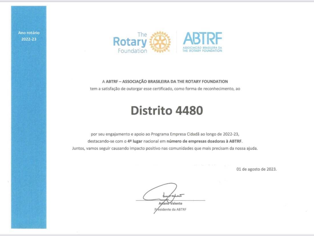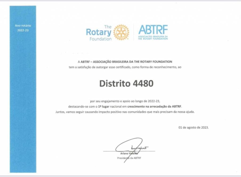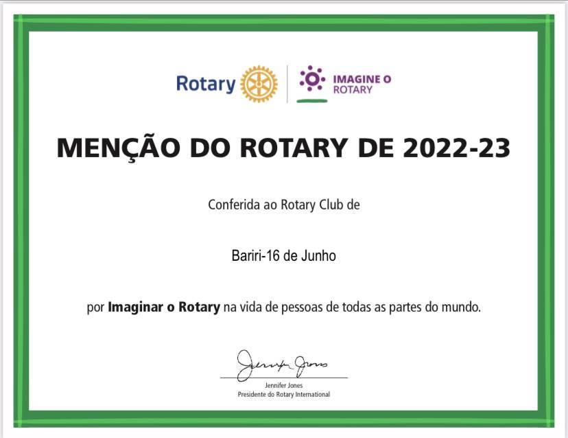 Durante o 46º Instituto Rotário, realizado em Foz do Iguaçú, recentemente, o Distrito 4480 de Rotary Internacional, do qual pertence o Rotary Club de Bariri 16 de Junho, recebeu 6 premiações de destaque pelas conquistas alcançadas no ano rotário 2022-2023. Os certificados serão emitidos ao clube, os quais constam: