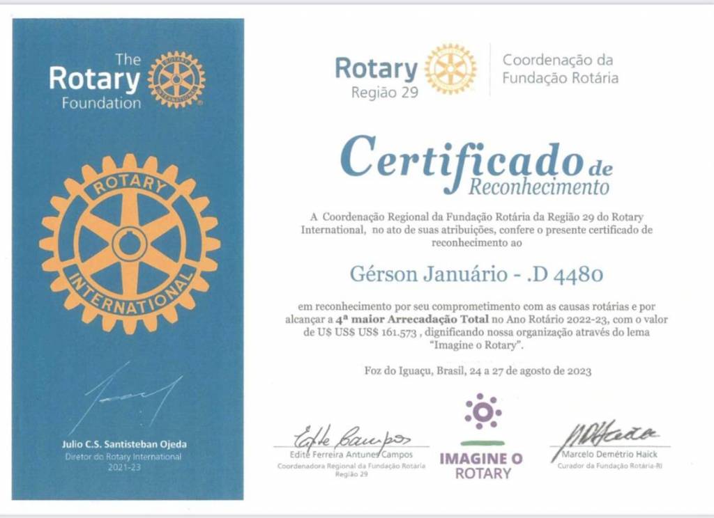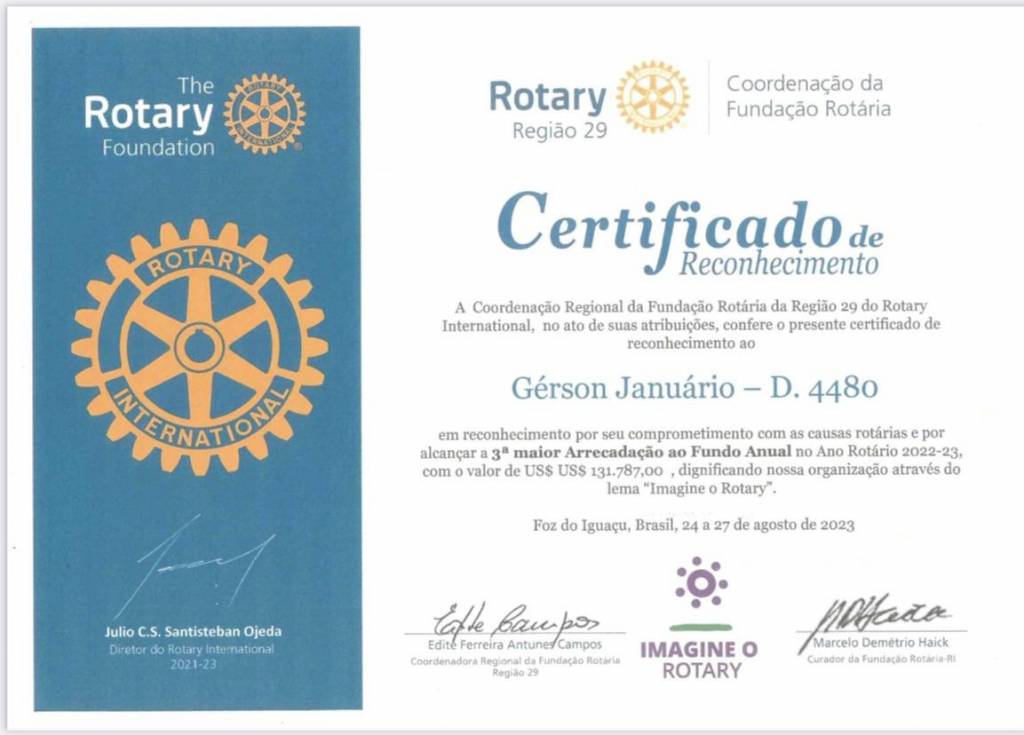 5) Terceiro maior Arrecadação ao Fundo Anual - Região 29, no Ano Rotário 2022/2023;
