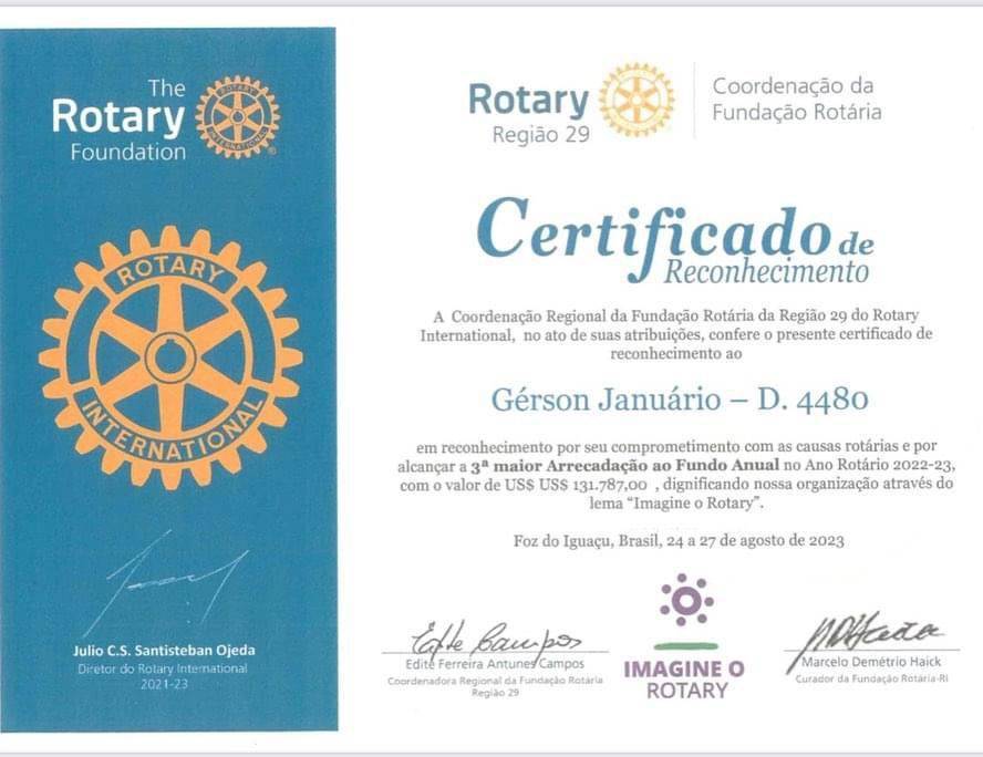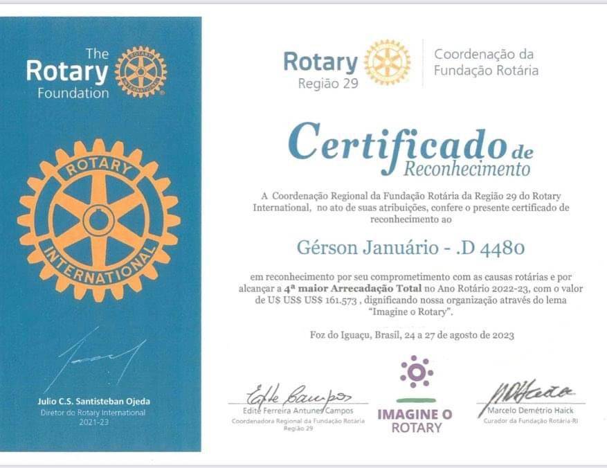 5) Terceiro maior Arrecadação ao Fundo Anual - Região 29, no Ano Rotário 2022/2023;