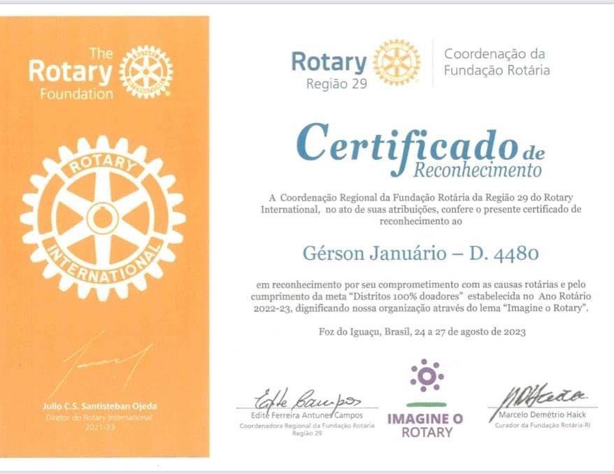 3) Distrito 100% dos Rotary Clubs doadores a Fundação Rotária;