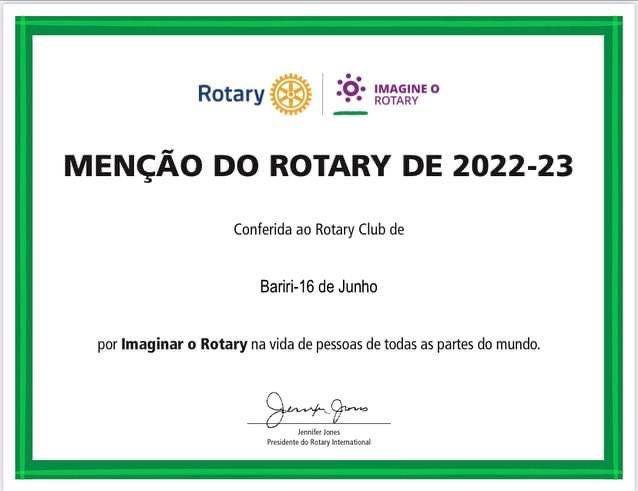 Anteriormente, o clube já havia recebido aquela que é considerada a maior honraria em Rotary, a menção pelos trabalhos prestados no ano rotário 2022-2023, emitido pela presidente do Rotary Internacional Jennifer Jones.