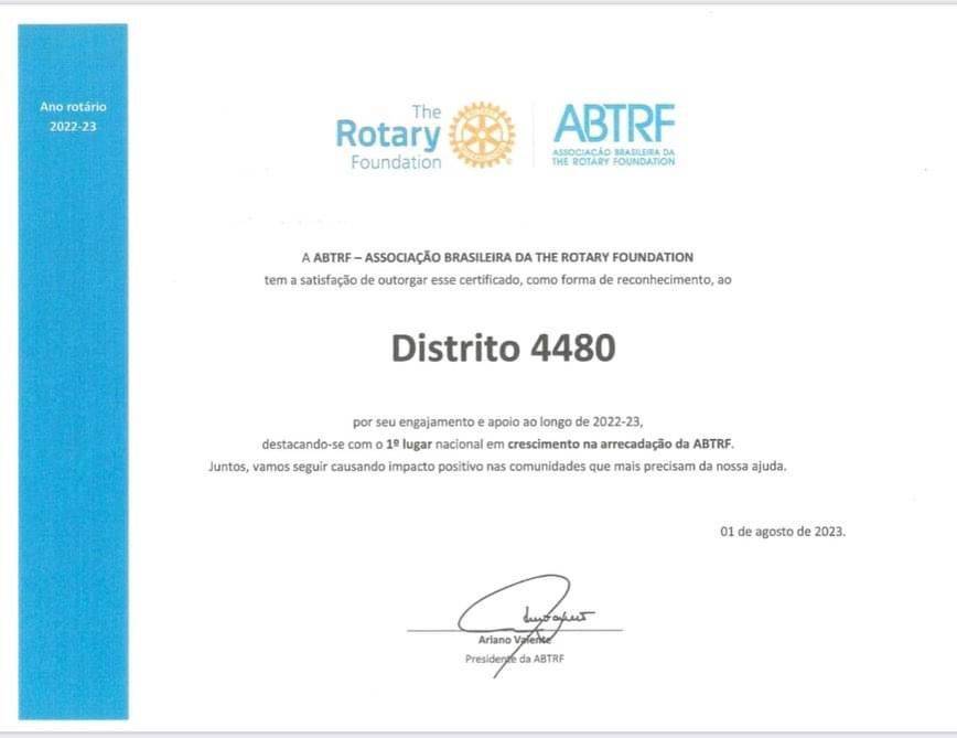 Distrito 4480 por seu engajamento e apoio ao Programa Empresa Cidadã ao longo de 2022-23, destacando-se com o 4º lugar nacional em número de empresas doadoras à ABTRF.