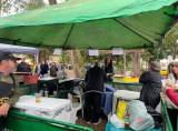 Ao fundo várias pessoas, mesas e mais barracas verdes.