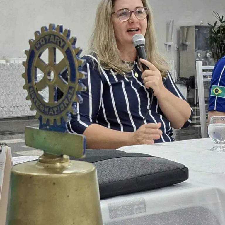 Uma mesa retangular, com toalha branca de renda, ao centro um sino, um martelo, um microfone e vários papéis. Ao lado esquerdo para o direito sentados: uma mulher, óculos, escrevendo em um caderno ou ata. Um homem, sem cabelos, óculos e fica atrás do sino. Ao lado um homem japonês, e na ponta da mesa um homem grisalho. Todos de camiseta azul do Rotary. Do lado direito, parte de outra mesa com toalha de renda branca. Ao fundo do lado direito, uma tribuna com o símbolo do Rotary e uma mulher loira falando no microfone. Acima na parede uma caixa de som.