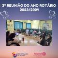 Audiodescrição: no card o registro de uma foto de várias pessoas em uma sala. Todos sentadas em formato de roda, alguns de frente para uma banca, outros atrás da banca, acima um telão e no título do card: 3 reunião do rotário 2023/2024. No rodapé, logo do lema crie esperança no mundo e do Rotaract Club de Olimpia Integração.