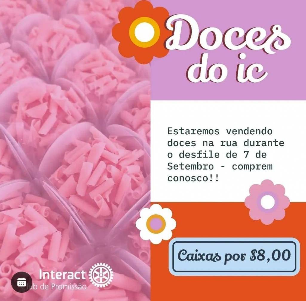 Do lado direito temos: parte cima lilás escrito em branco: Doces do IC, seguindo uma parte branca escrito em preto: estaremos vendendo doces na rua durante o desfile de 7 de Setembro- comprem conosco!!