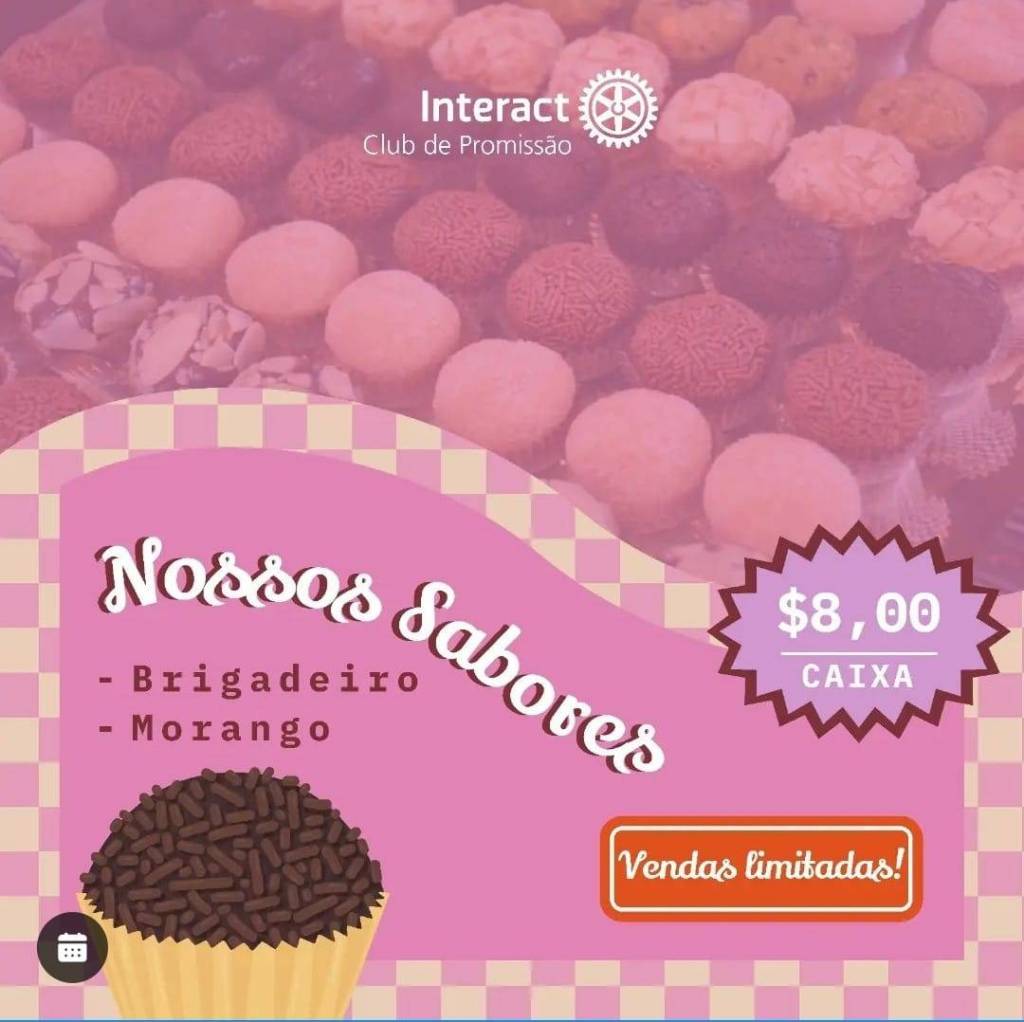 Não perca essa oportunidade de saborear verdadeiras maravilhas dos deuses, cuidadosamente elaboradas com amor, carinho e dedicação pelos membros do Interact. Caso você nos encontre pelas ruas usando nossos uniformes e segurando essas tentações doces, por favor, não hesite em nos abordar para garantir a sua caixinha. Cada embalagem contém 4 brigadeiros, sendo dois tradicionais e dois de morango.