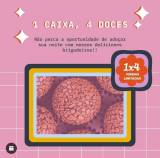 Um card dividido no meio vertical, sendo do lado esquerdo vários docinhos rosa com granulado rosa, todos em forminhas rosa. E na parte inferior esquerda em branco o logo do Interact Club de Promissão.