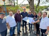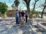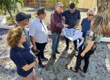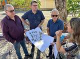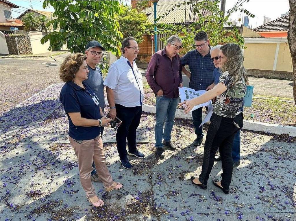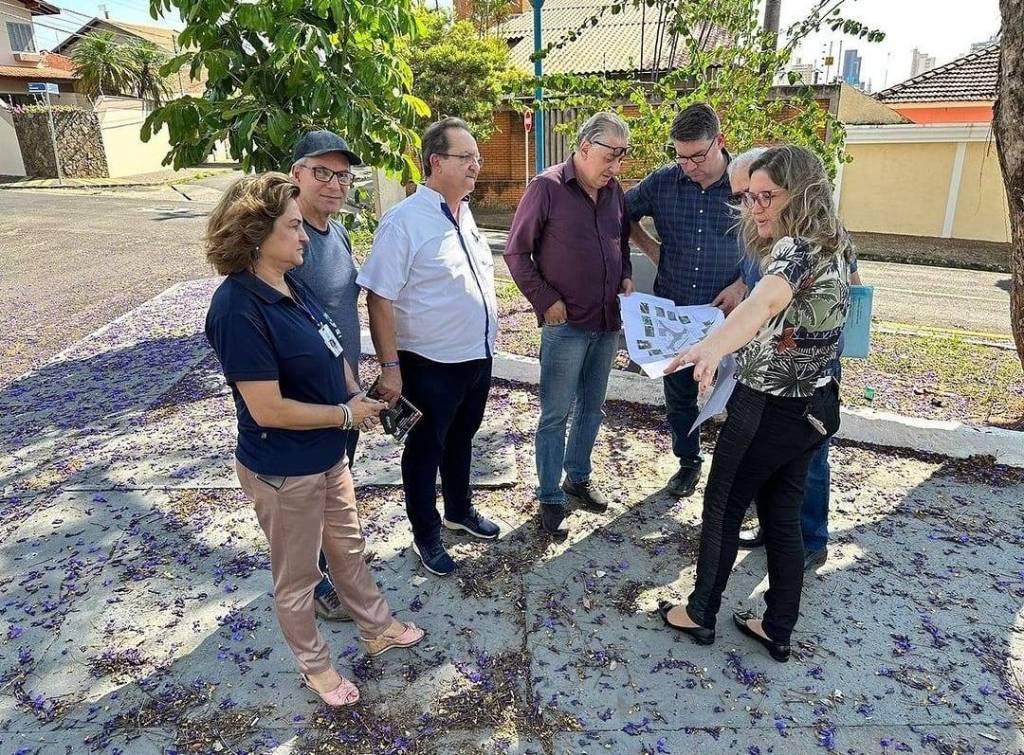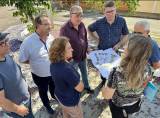 Lado esquerdo em pé: 1 senhor, grisalho, camiseta branca e calça jeans, 1 homem de camisa vinho, calça jeans, cabelos pretos e de óculos, 1 homem camisa azul escura xadrez, calça jeans, óculos, segurando com as 2 mais um papel grande com planta de reforma, 1 senhor grisalho, calvo, óculos, camiseta polo azul marinho, calça jeans, 1 mulher de blusa azul marinho e calça marrom, segurando um celular com a mão esquerda, uma mulher, loira, blusa florida, calça preta, óculos, segurando embaixo do braço direito uma pasta azul e com as 2 mais segurando uma planta de reforma, 1 senhor de camisa branca, calça preta, óculos - gov.do distrito 2024/25, Éder. Todos sorrindo.