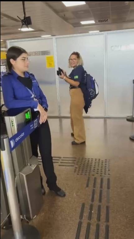 Ao fundo, cadeiras, pessoas. Local é um aeroporto.