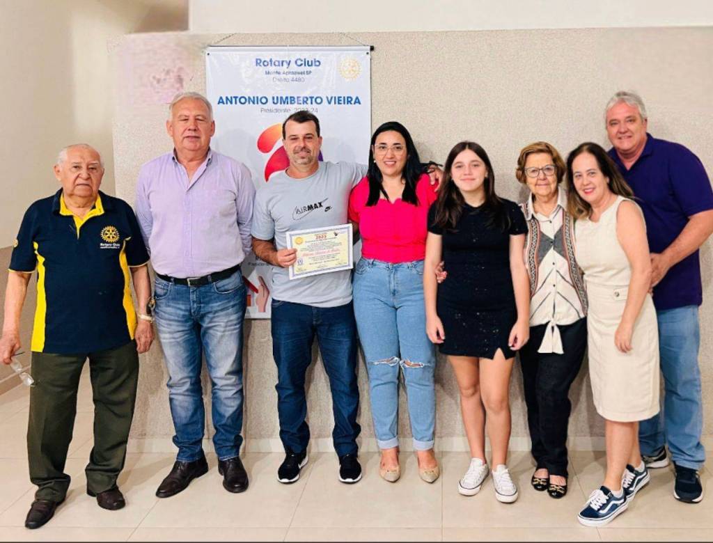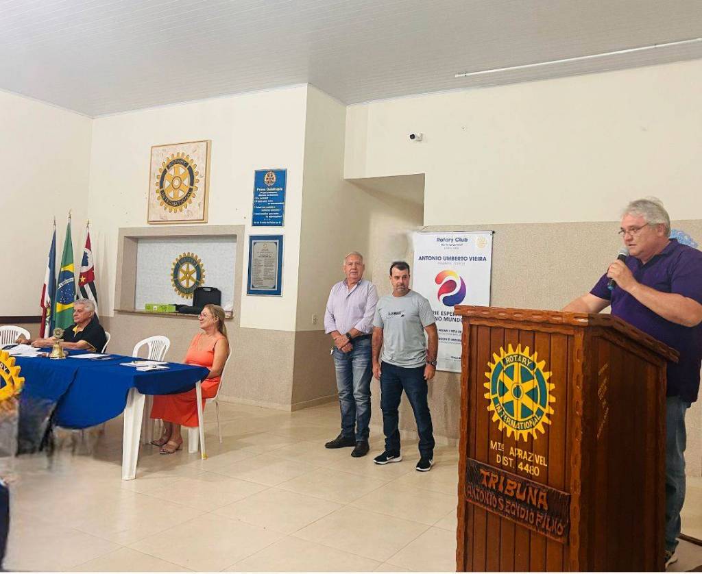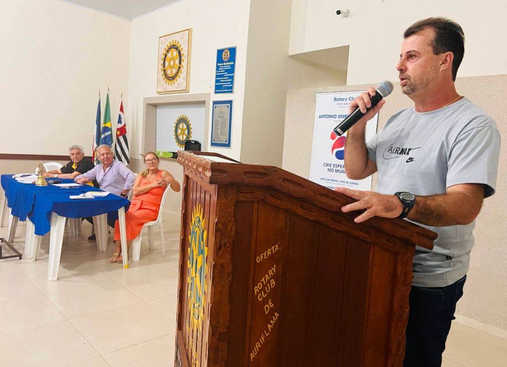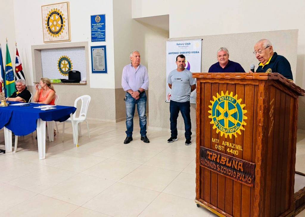 Ao fundo, na parede marrom claro o banner do ano rotário do Rotary Club de Monte Aprazível.