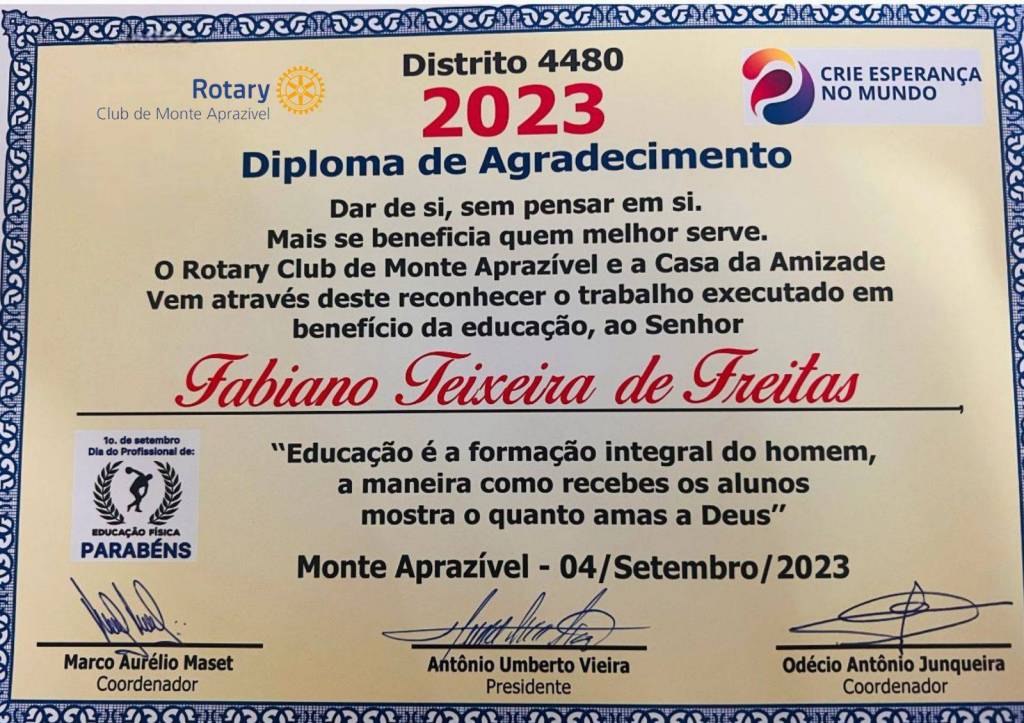No dia 01 de Setembro é comemorado o Dia do Profissional de Educação Física, e o Rotary Club de Monte Aprazível homenageou nesta segunda-feira - dia 04/09 o Professor “Fabiano Teixeira de Freiras”.