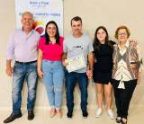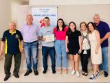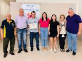 Senhor calvo, grisalho, baixo, camiseta preta do Rotary e óculos, homem calvo, grisalho, camisa manga longa lilás e calça jeans - Pres. do Rotary Club de Monte Aprazível, ele segura com sua mão direita junto com o homenageado sorrindo, que usa uma camiseta cinza, calça jeans, calvo, cabelos pretos, segurando com sua mão esquerda um certificado.