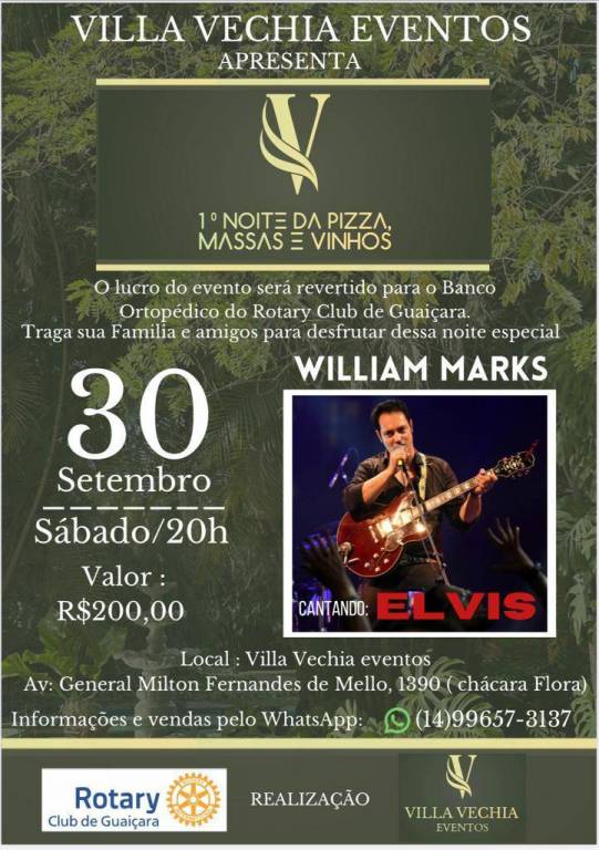 30 de setembro - sabado as 20horas - imagem de um cantor com cabelos escuros e com uma guitarra na mãos, de nome WILLIAM MARKS cantando Elvis. Ao lado, indicando valor de R$200,00, indicação de Local : Villa Vechia eventos. Av: General Milton Fernandes de Mello, 1390 ( chácara Flora).Informações e vendas pelo WhatsApp: (14)99657-3137. Abaixo, símbolo Rotary Club de Guaiçara - REALIZAÇÃO VILLA VECHIA EVENTOS.