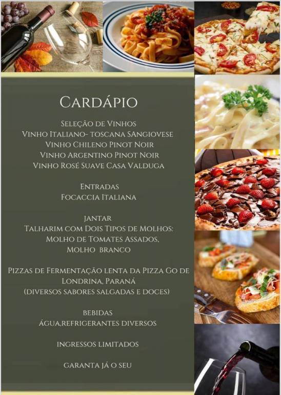 Vinho Italiano - TOoscana Sangiovese, Vinho Chileno Pinto Noir, Vinho Argentino Pinot Noir, Vinho Rosé Suave, Casa Valduga. Entradas: Focaccia Italiana, Jantar: Talharim com dois tipos de molhos, de tomates assados e branc. Pizzas de fermentação lenta de Londrina - Paraná (Diversos sabodres salgadas e doces) Bebidas: águas e refrigerrantes diversos. No final, a descrição INGRESSOS LIMITADOS GARANTA JÁ O SEU.